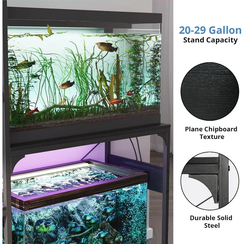 - Double Tank Stand: Our stand features a two-tiered structure. With a desktop size of 31.5″L*15.7″ W, it can accommodate 10-29-gallon aquariums both on the top and bottom. It can easily support most standard-sized fish tanks