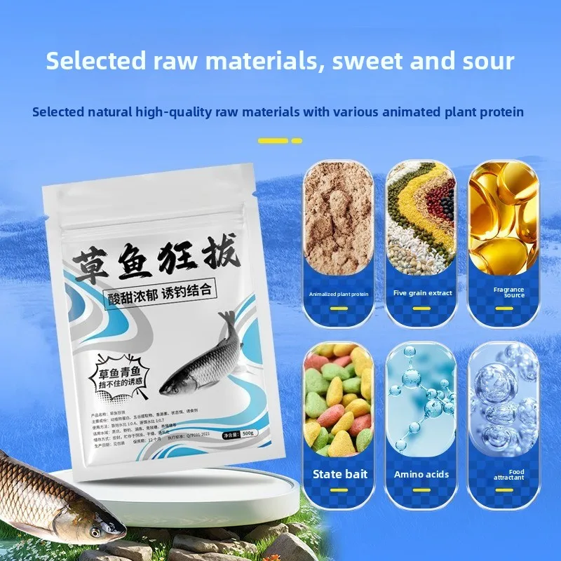 High temperature puffing, natural fermentation, strong hooking, arbitrary throwing, diffusion into water, long-lasting atomization, secret addition, fish lure factor Rich flavor, easy to come out of the state and quickly gather fish The bait is full and not easy to reverse water, saving fishing time Good atomization state, three-dimensional atomization, keeping fish for a long time Accompanied by the scattering of granular bait, a columnar atomization zone and a slow scattering zone are formed This can reduce the vigilance of the fish and play a role in quickly luring fish to gather fish