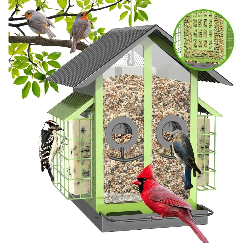 • 🐦Sturdy Bird Feeder: Except for the transparent material panel on the front of the bird feeder, the rest are made of metal.ensuring it can withstand the challenges posed by outdoor elements. Its durability is further reinforced by a layer of waterproof paint, offering excellent protection against rain, wind, and harsh weather conditions. Rest assured, this large bird feeder will maintain its pristine condition for years to come.