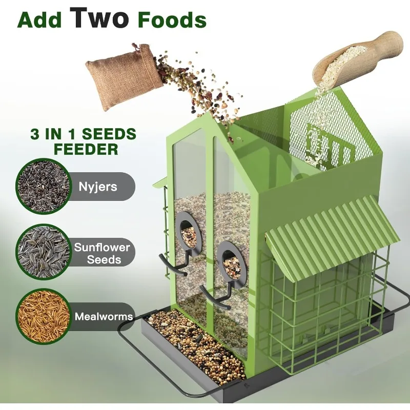 • 🐦Functional Compartments: Equipped to accommodate two types of seeds, such as sunflower seeds and thistle, this birdfeeders features divided feeding areas. This segregation enables the separation of small finches from larger birds, mitigating conflicts between them. With a capacity of up to 4 lbs of seeds, the bird house feeders design ensures a steady supply for our feathered friends, automatically refilling after birds have eaten.