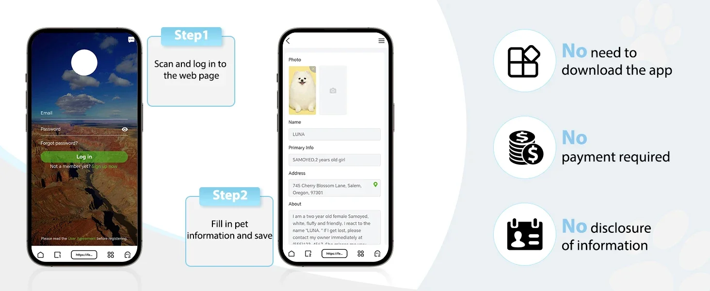 [𝐑𝐞𝐜𝐞𝐢𝐯𝐞 𝐈𝐧𝐬𝐭𝐚𝐧𝐭 𝐄𝐦𝐚𝐢𝐥] If someone scans the QR code, strangers can scan the code to check the phone number you left, or send address to your email, keep you stay informed and locate your pet quickly. Free online pet page prevent lost, No Subscription or Any Other Fees!